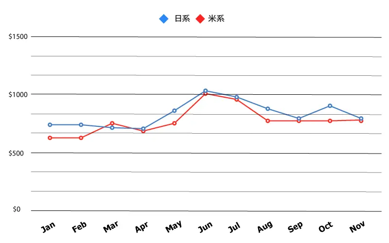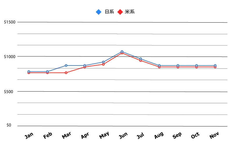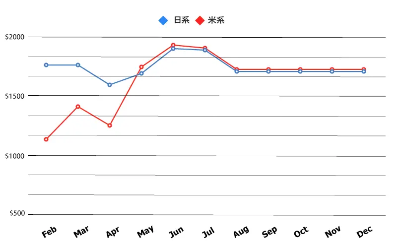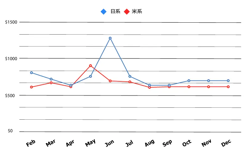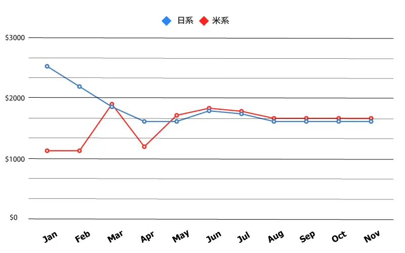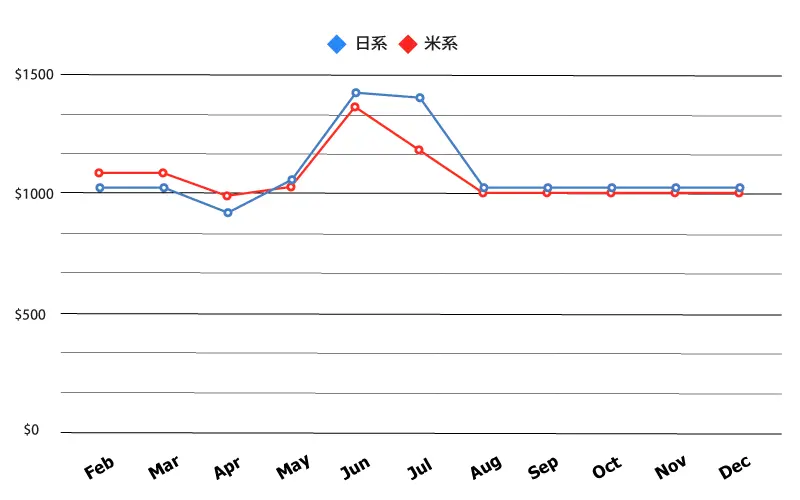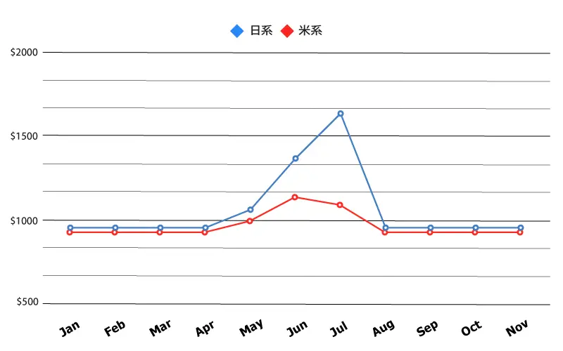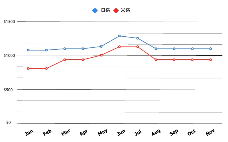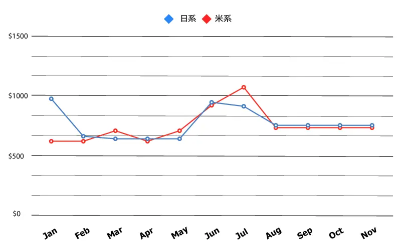 ◆ 各月ともに最安値を記載しておりますので、料金グラフはおおよその目安としてご覧ください。