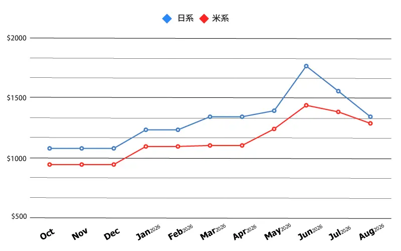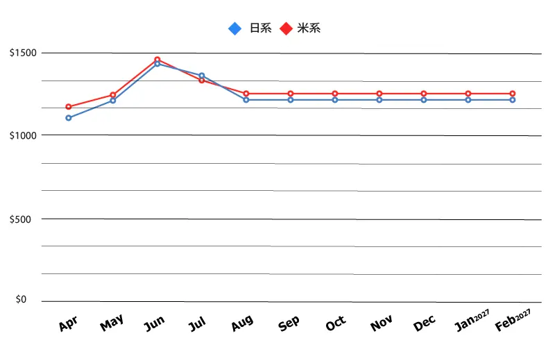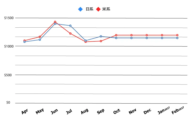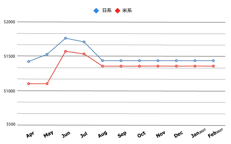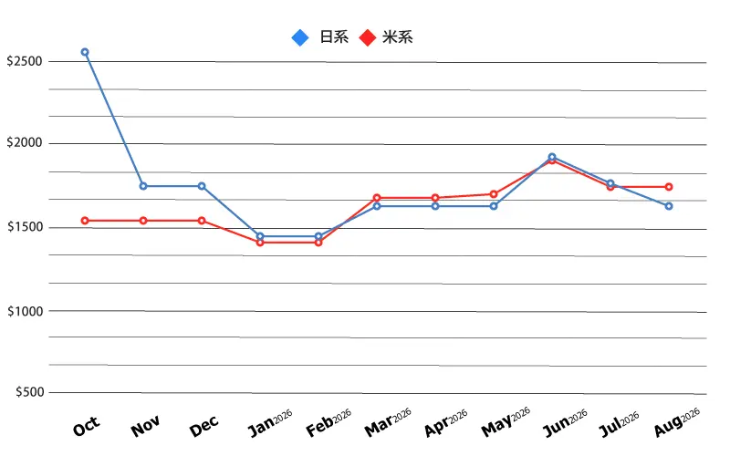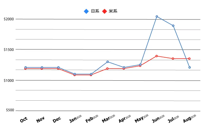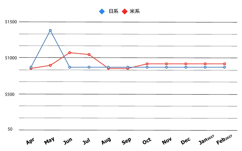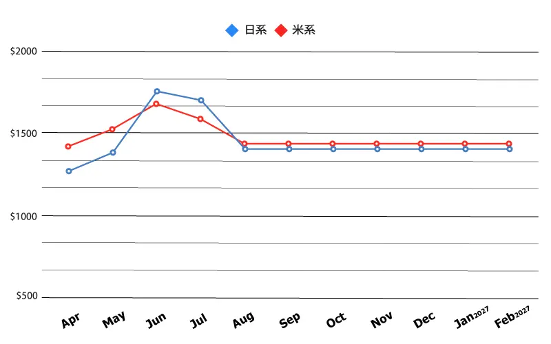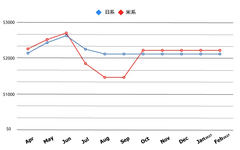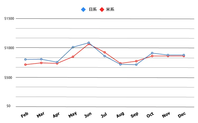◆ 各月ともに最安値を記載しておりますので、料金グラフはおおよその目安としてご覧ください。
