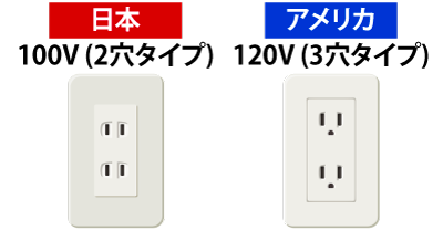 | 電圧 | アメリカの電圧は120V/60Hzでコンセントは3穴タイプです。(日本の2穴タイプも使用可能) お持ちの電子機器を利用する場合は、海外の電圧にも対応してる機種かどうか事前にご確認ください。また、長時間利用する場合は旅行用小型変圧器を持参することをおすすめします。 ![]() |